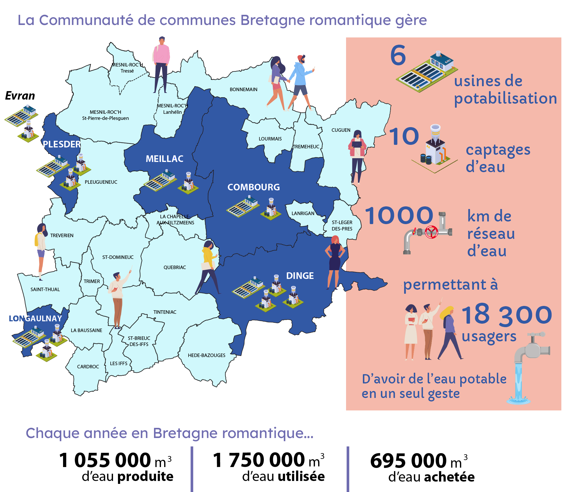 Avec ses 10 captages d’eau souterraine et ses 6 stations de production d’eau potable, la Communauté de communes Bretagne romantique produit 1 000 000 m3 d’eau chaque année. 1 800 000 m3 sont cependant nécessaires à l’alimentation de l’ensemble de ses abonnés (particuliers, entreprises, exploitations agricoles, hébergements touristiques etc.). Pour combler ce déficit, la Collectivité importe 800 000 m3 d’eau potable par an, qu’elle achète aux territoires voisins (Dinan Agglomération, Collectivité Eau du Bassin Rennais).