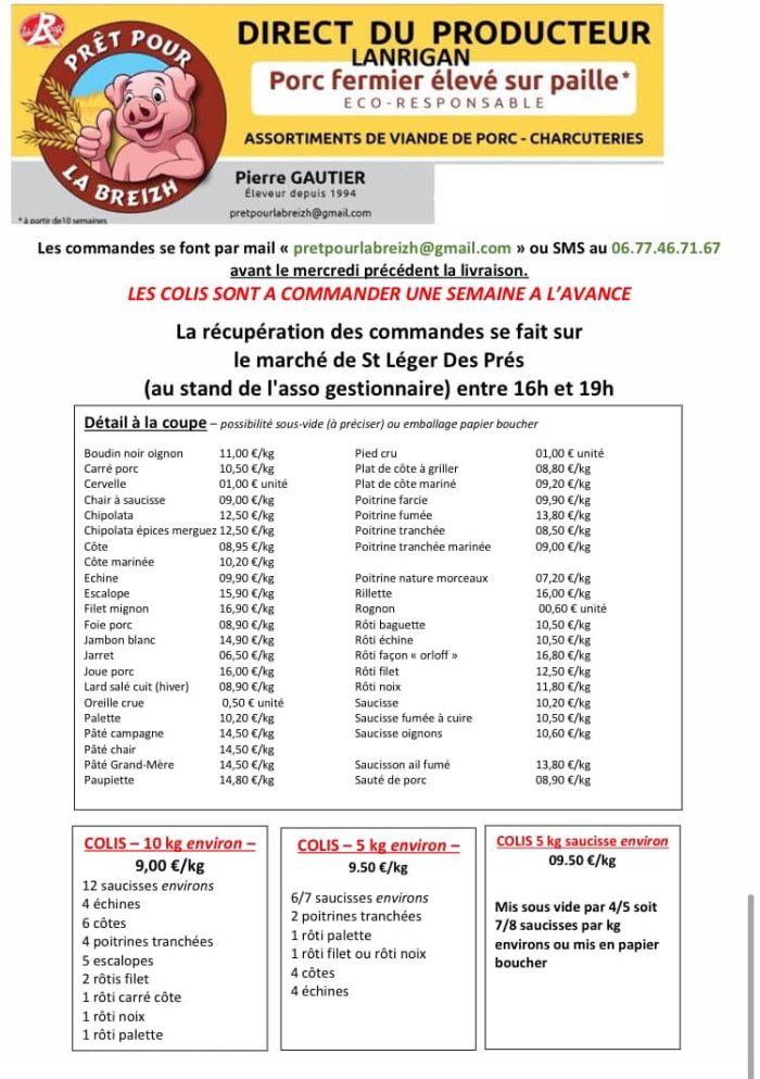 1°/ La charcuterie et viande de porc sont à réserver en pré-commande avant jeudi 05/03 (par mail pretpourlabreizh@gmail.com ou par sms / téléphone au 06.77.46.71.67) auprès du producteur). Propositions, tarifs et coordonnées sur l’affiche en pièce-jointe. Paiement à la livraison.