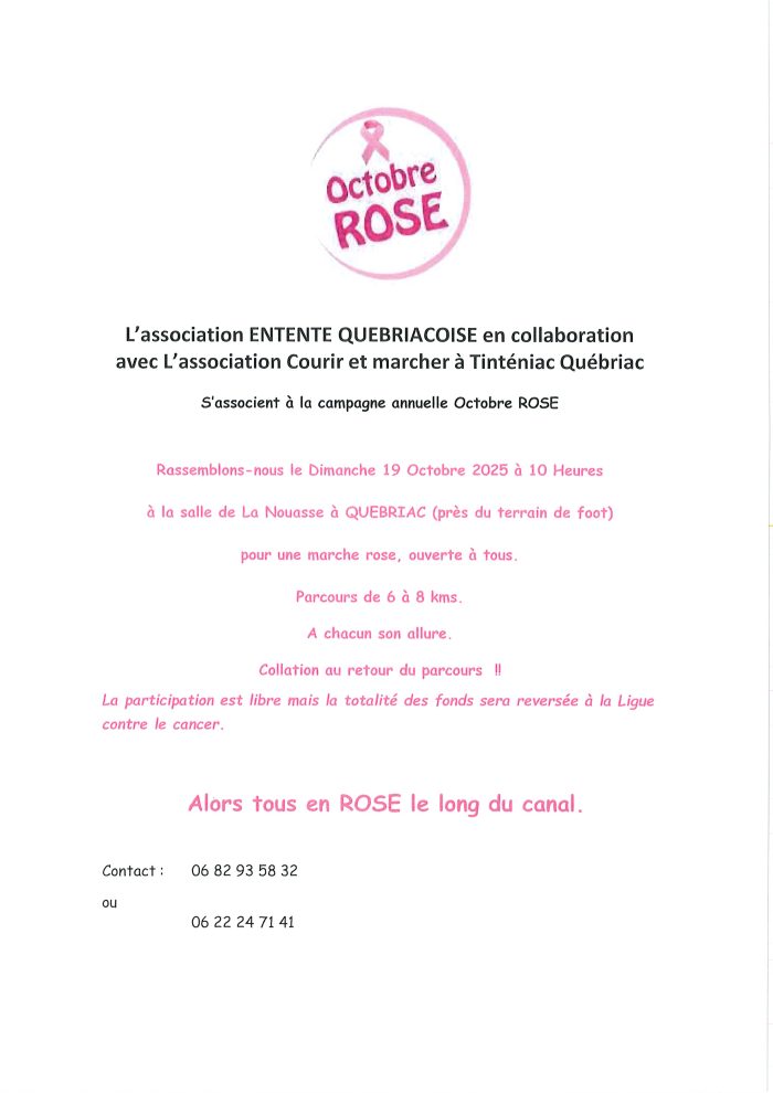 Rassemblons-nous le Dimanche 19 Octobre 2025 à 10 Heures à la salle de La Nouasse à QUEBRIAC (près du terrain de foot) pour une marche rose, ouverte à tous.