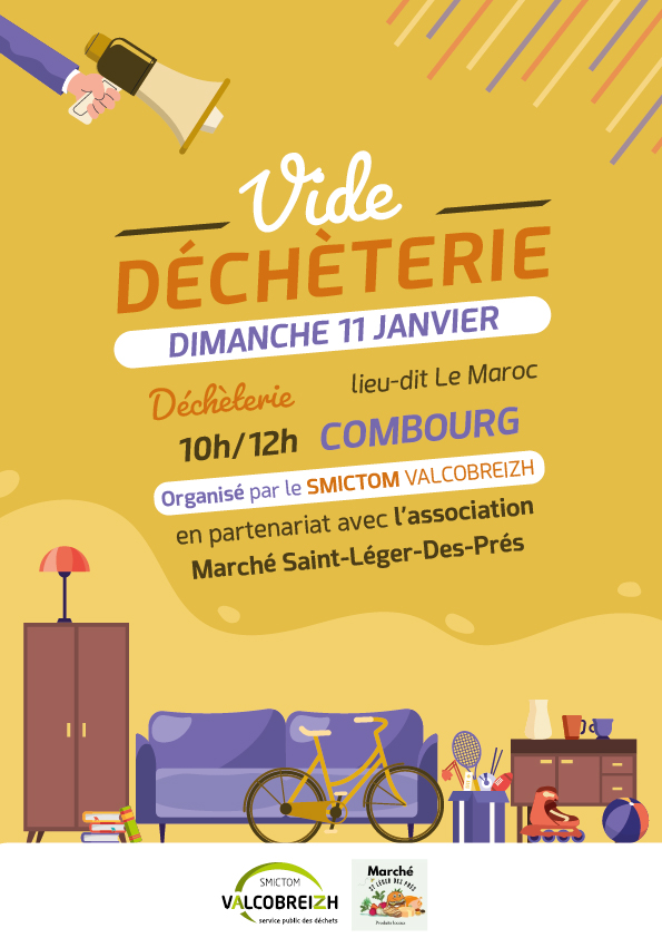L’association Marché St Léger des prés, organise, en partenariat avec Valcobreizh, un Vide-déchèterie le Dimanche 11 Janvier 2026 de 10 h à 12 h, à la déchèterie de Combourg (Lieu-dit Le Maroc) !