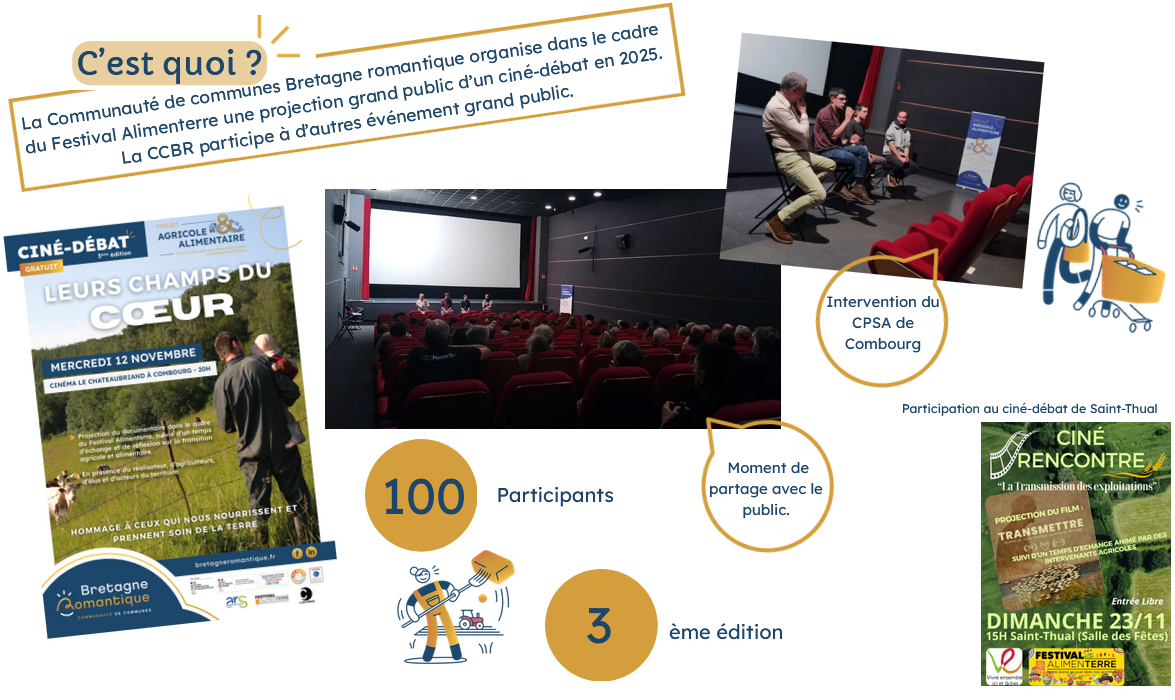 En 2025 a eu lieu la 3ème édition des ciné-débats dans le cadre du Festival Alimenterre a été organisé autour des thèmes de l’agriculture et de l’alimentation. L’occasion de prendre conscience des enjeux actuels sur notre territoire et d’échanger sur ces sujets que l’on soit élu, agriculteur ou habitant…